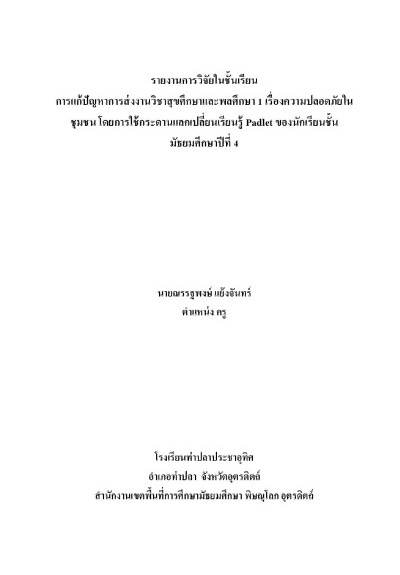 ชื่อผลงาน : วิจัยในชั้นเรียน เรื่อง การแก้ปัญหาการส่งงานวิชาสุขศึกษาและพลศึกษา 1 เรื่องความปลอดภัยในชุมชน โดยการใช้กระดานแลกเปลี่ยนเรียนรู้ Padlet ของนักเรียนชั้นมัธยมศึกษาปีที่ 4